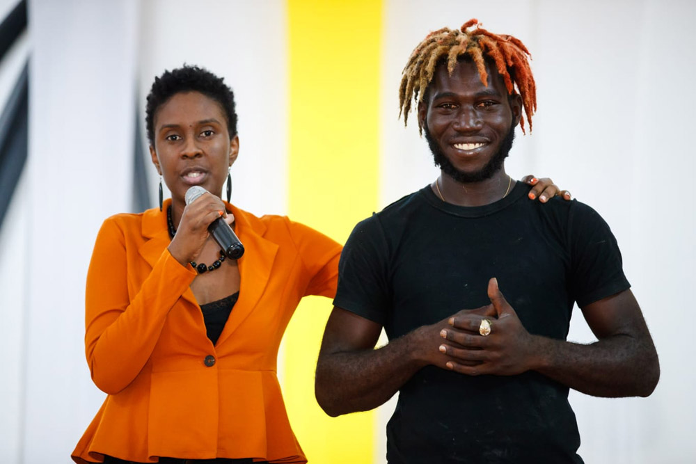 Assistant Treasurer of the NDP Young Democrats, Therese Ollivierre (right), presenting award to Dexroy Creese